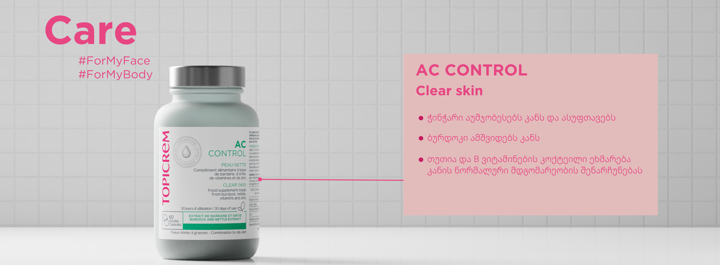 ტოპიკრემის კვებითი დანამატი კომბინირებული და ცხიმიანი კანისთვის ოპტიმალურია, თუ მას AC CONTROL ხაზის სხვა პროდუქტებთან ერთად გამოიყენებთ სრულყოფილი რუტინისათვის.