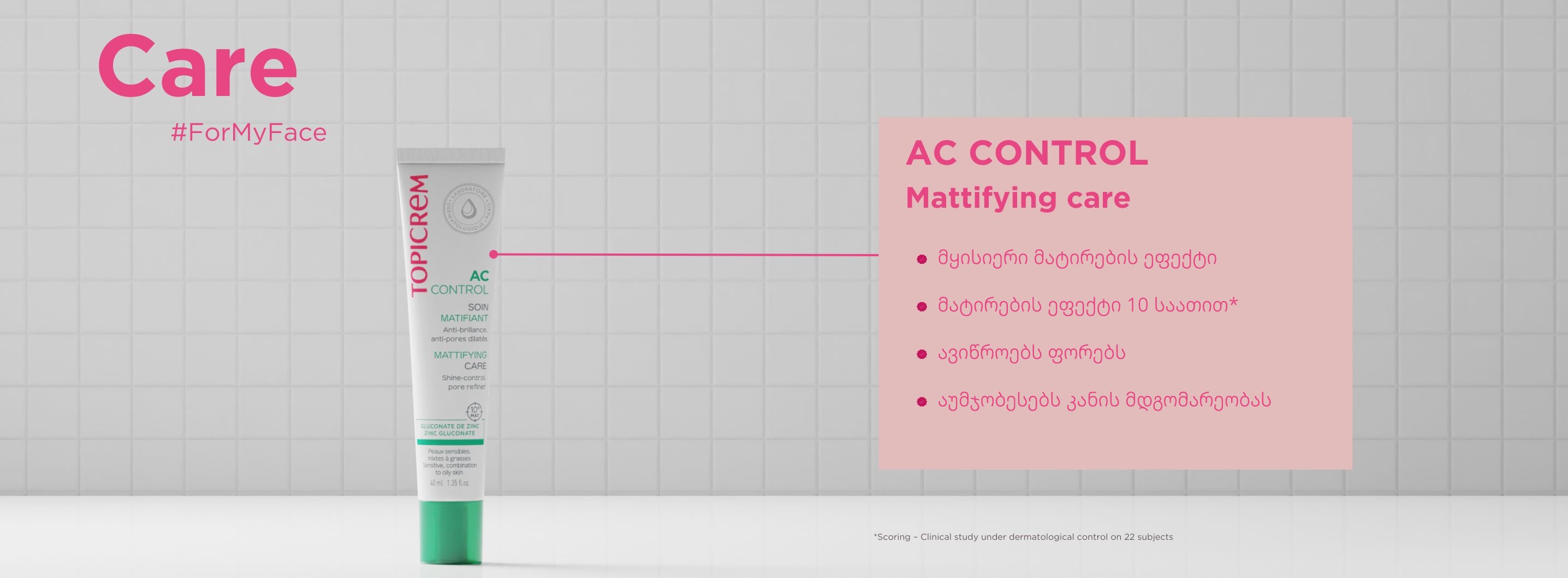 TOPICREM AC CONTROL სახის კრემი მატირების ეფექტით მყისიერად ანიჭებს კანს მატირების ეფექტს და აუმჯობესებს კანის ხარისხს ფორების შევიწროების გზით 10 საათის განმავლობაში*. ეს კრემი კანს ტოვებს სუფთასა და დატენიანებულს, ხოლო გამოყენება არის მარტივი და სასიამოვნო მისი გელ-კრემისებრი ტექსტურის წყალობით.