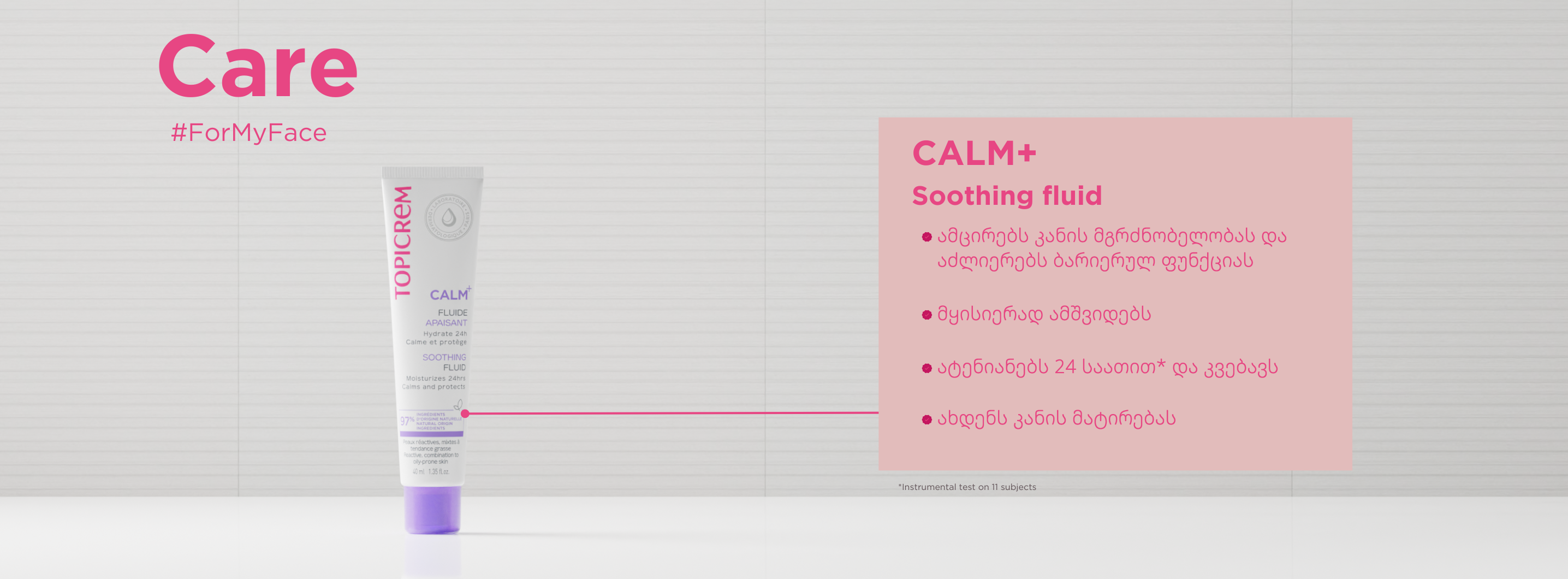 CALM+ დამამშვიდებელი ფლუიდი, რომელიც გამდიდრებულია მზესუმზირის ზეთით, ქლიავის ზეთითა და ალანტოინით. დამამშვიდებელი და დამატენიანებელი ფლუიდი ამშვიდებს გაღიზიანების შეგრძნებებს და ამცირებს კანის მგრძნობელობას. ის ატენიანებს კანს 24 საათის განმავლობაში და მატირების ეფექტს იძლევა. დამამშვიდებელი ფლუიდი იცავს და ამაგრებს კანის ბარიერს. კანი მყისიერად იბრუნებს კომფორტს, ის ხდება რბილი და ელასტიური.