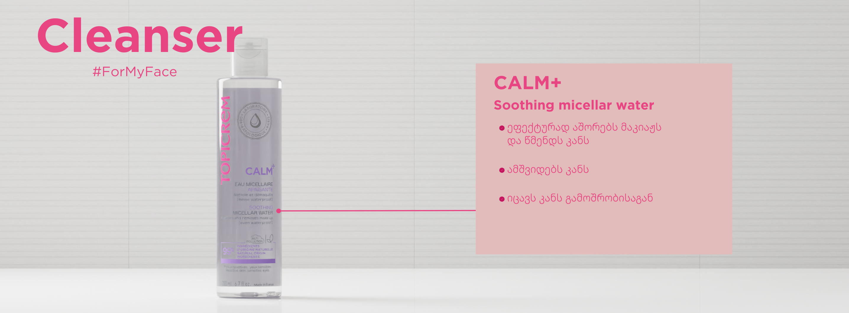 CALM+ დამამშვიდებელი მიცელარული წყალი, რომელიც გამდიდრებულია გლიცერინითა და ალანტოინით, მაკიაჟის მარტივ მოშორებასა და ეფექტრუ წმენდას უზრუნველყოფს. ის აშორებს წყალგამძლე მაკიაჟსაც კი და ასუფთავებს კანს გარე დაბინძურებისაგან. ტოპიკრემის დამამშვიდებელი მიცელარული წყალი ამცირებს დისკომფორტის შეგრძნებას და კანს ტოვებს სრულყოფილად სუფთასა და სასიამოვნოს.