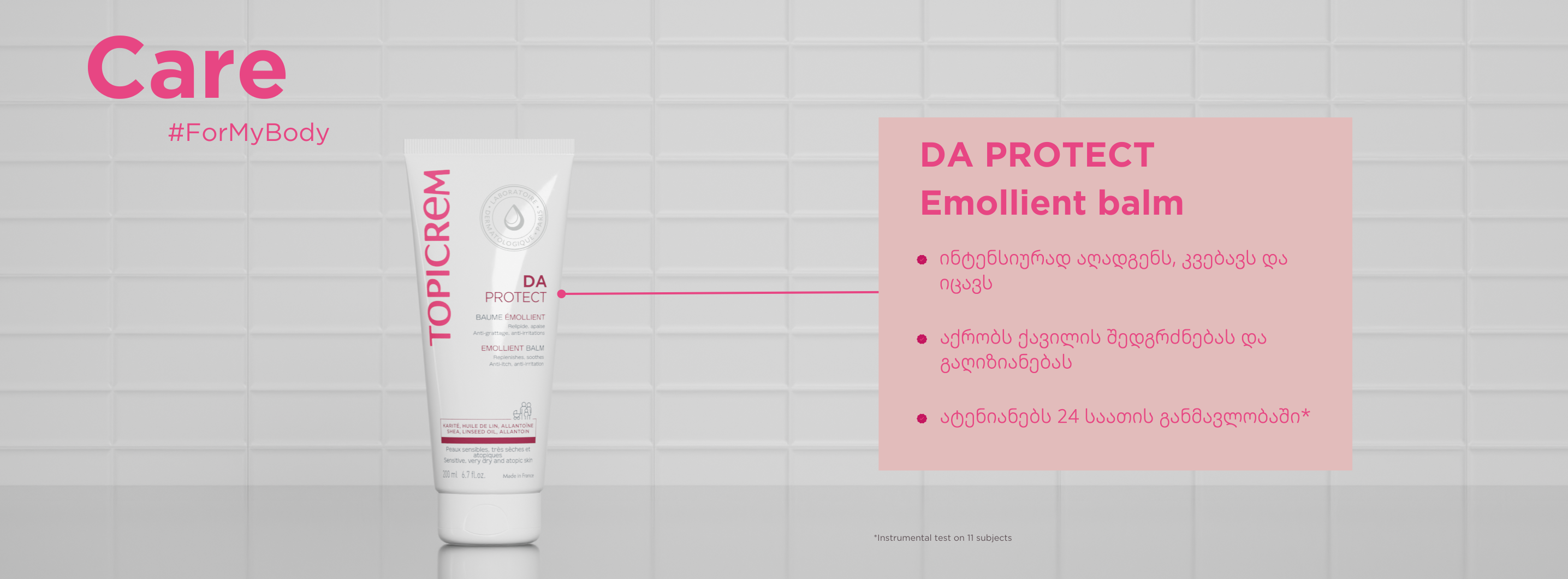 TOPICREM DA PROTECT ემოლიენტური ბალზამი, რომელიც გაჯერებულია ომეგა 3-ითა და ომეგა 6-ით მდიდარი სელის ზეთით, შის კარაქითა და ალანტოინით, ინტენსიურად აღადგენს ლიპიდებს და ამშვიდებს მთელი ოჯახის (ჩვილი, ბავშვი, ზრდასრული) ძალიან მშრალ და ატოპიურ მგრძნობიარე კანს.