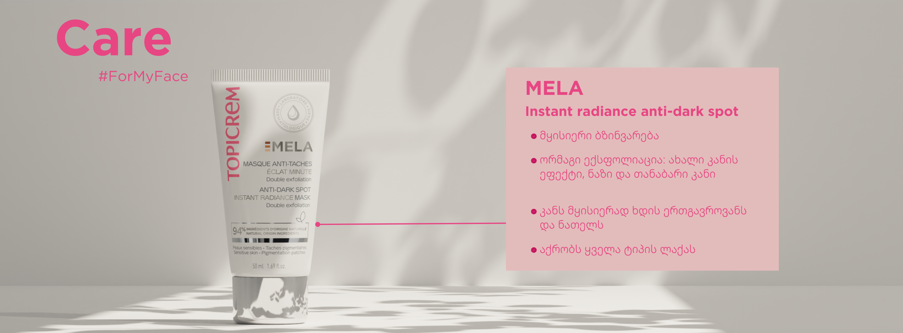 • სრული დასახელება: TOPICREM - MELA ANTI-DARK SPOT INSTANT RADIANCE MASK