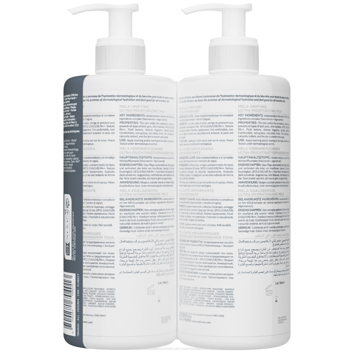 TOPICREM MELA პიგმენტური ლაქების საწინააღმდეგო ულტრა-დამატენიანებელი რძე, #1 ლაქების საწინააღმდეგო რძე*, ატენიანებს კანს 24 საათის განმავლობაში** და ათანაბრებს მის ტონალობას. MELA კომპლექსის*** კანის ტონალოების გამაერთიანებელ აქტიურ ინგრედიენტებთან კომბინაცია უზრუნველყოფს სხეულზე არსებული პიგმენტური ლაქების კორექციას. ულტრა-დამატენიანებელი ლაქების საწინააღმდეგო რძის შემადგენლობშია მზისგან დამცავი საშუალება SPF15 დაცვით, რაც ხელს უწყობს ახალი ჰიპერპიგმენტაციის გაჩენის პრევენციას. მისი მსუბუქი და სასიამოვნო ტექსტურა უზრუნველყოფს კომფორტს და ინტენსიურ დატენიანებას.